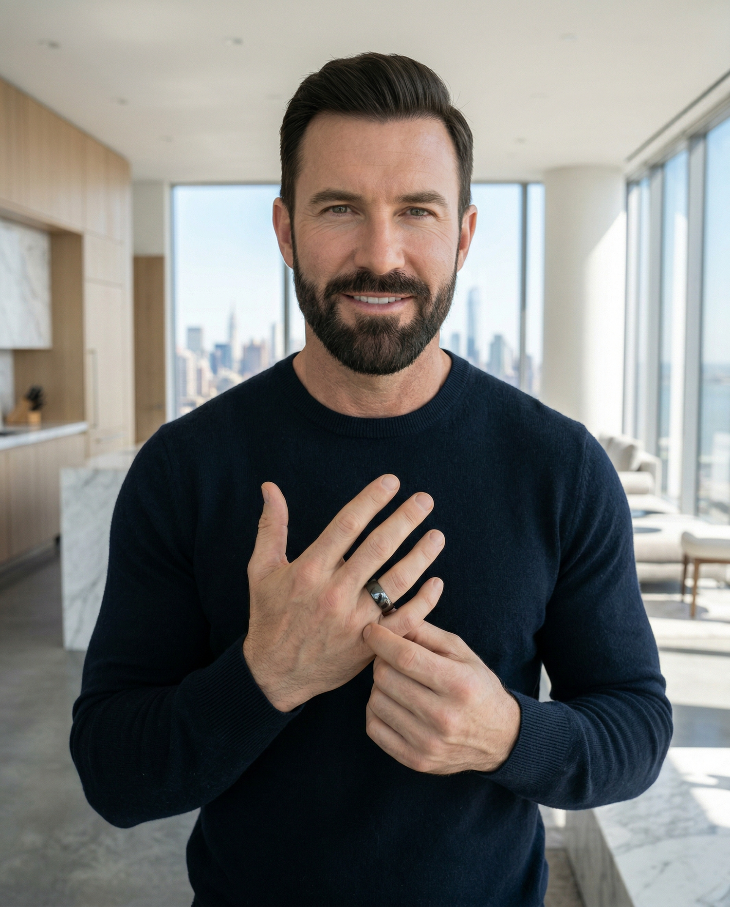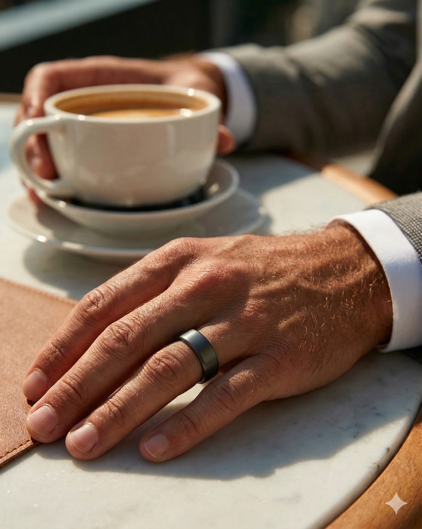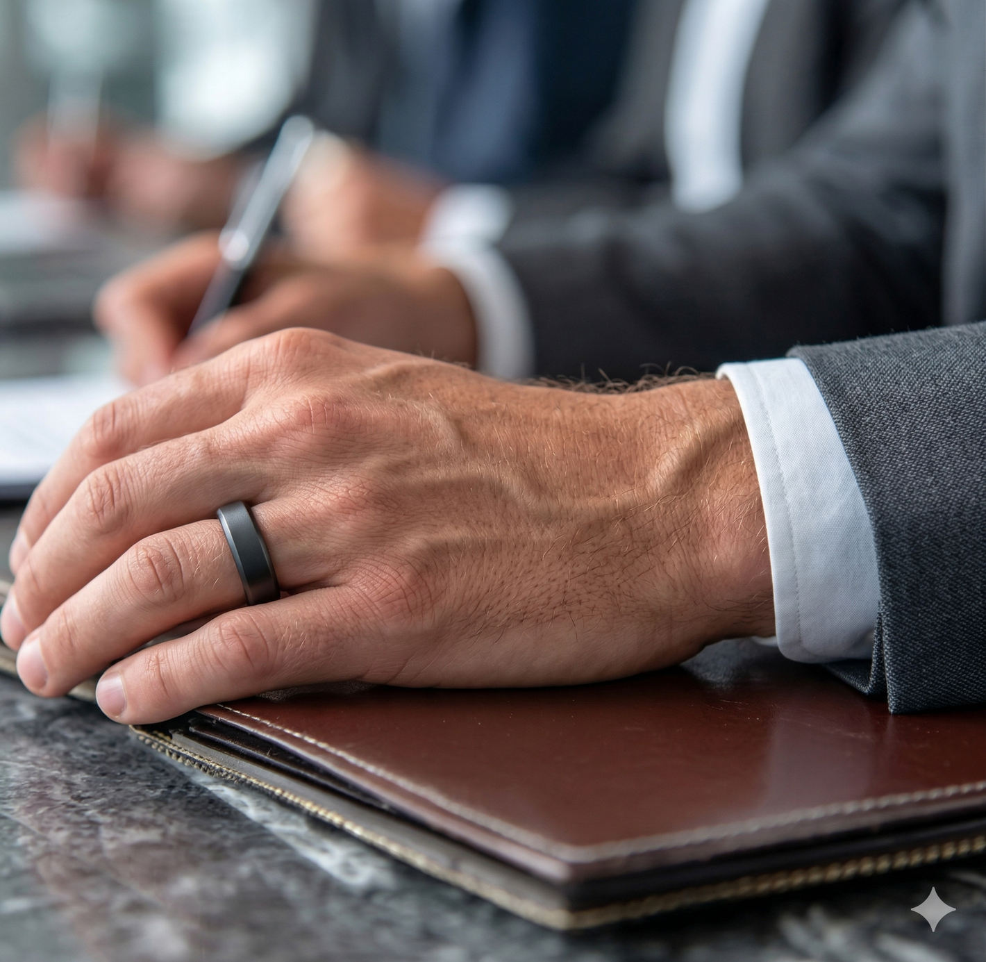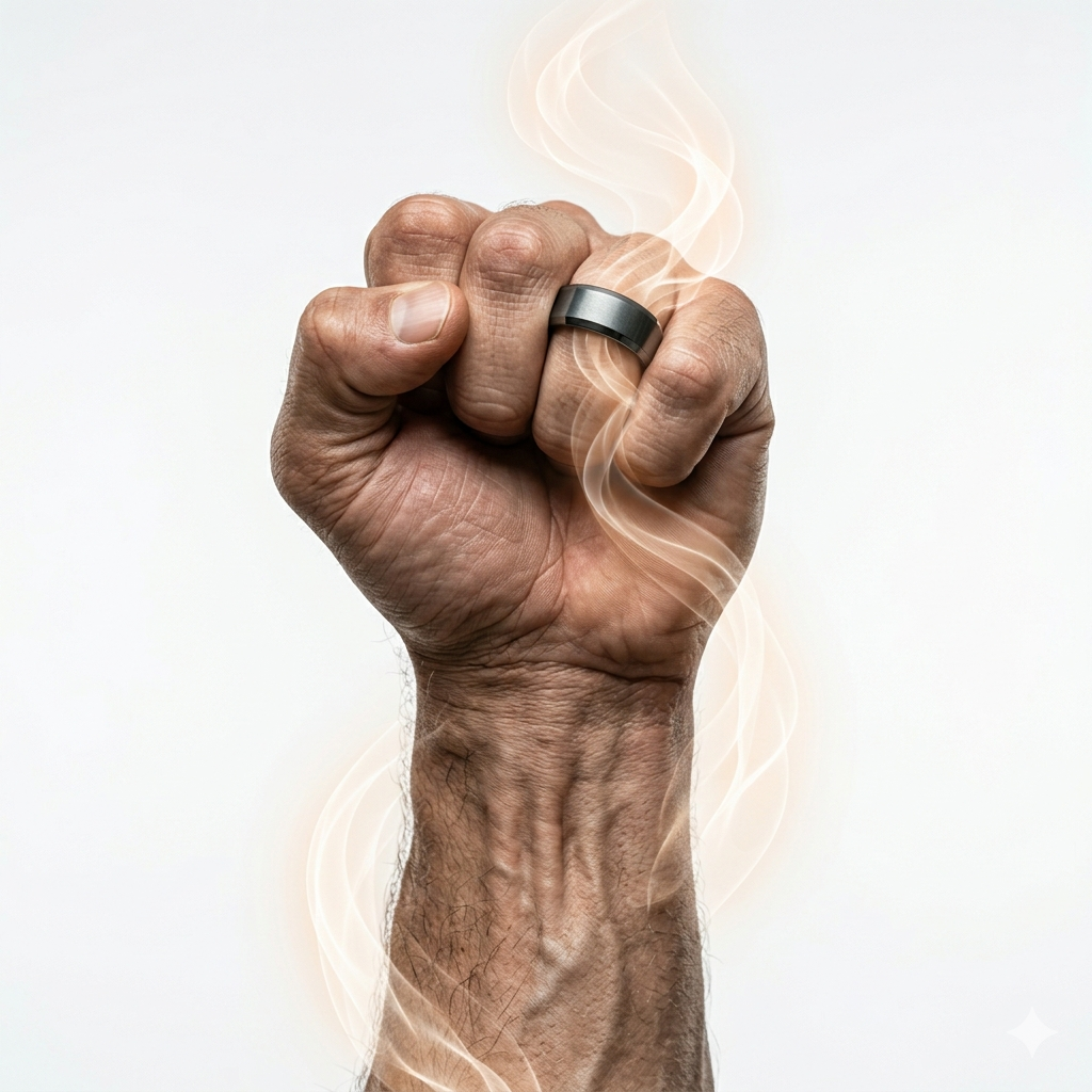 Dès que vous passez l’Insigne au doigt, la densité unique de l’Hématite brute opère. Ce n'est pas qu'un objet, c'est un ancrage physique. Votre posture se redresse, votre présence s'alourdit. Vous ne subissez plus l'espace, vous l'occupez.